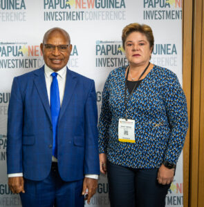 Richard Maru, Minister for International Trade and Investment, and Zanie Theron, Partner-in-Charge of KPMG’s South Pacific Practice, at the 2025 Business Advantage PNG Investment Conference. Credit: Stefan Daniljchenko/BAI