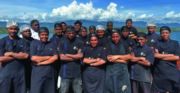 Chef Neori Mokotanavanua (in white) with his crew. Credit: Supplied by Loloata Private Island Resort